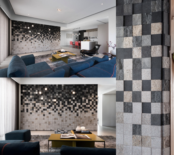 Ruang tamu dengan dinding ubin keramik yang menarik.