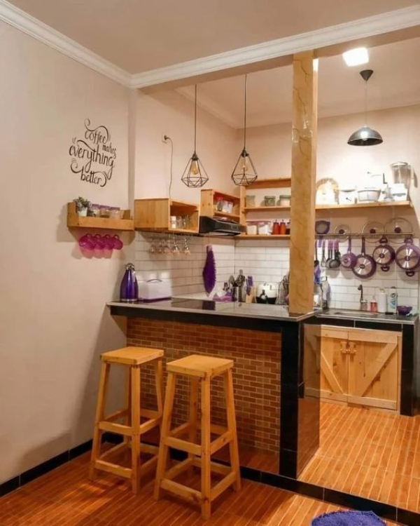 - - Dapur dengan mini bar yang retro: Jika Anda suka dengan gaya retro, Anda dapat menghadirkan mini bar dengan desain yang retro pada dapur Anda. Misalnya, mini bar dengan material kayu dan warna-warna yang cerah. Tambahkan beberapa aksesori vintage seperti lampu gantung atau kursi bar dengan desain vintage.