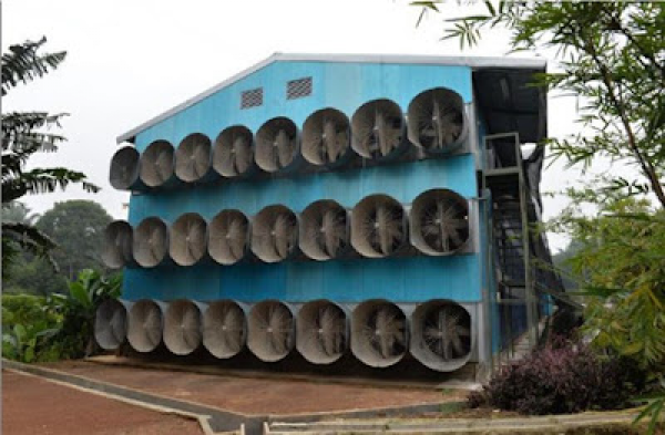 Kandang ternak ayam tipe tertutup dengan blower sebagai sistem sirkulasi udaranya.