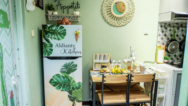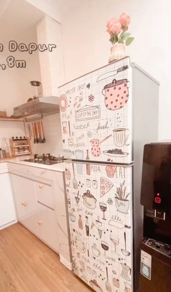 Ruang tamu sengaja dibuat plong langsung ke dapur tanpa sekat dinding.