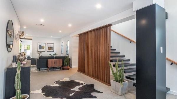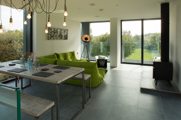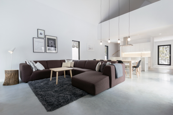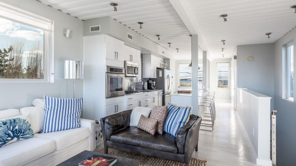 Dengan interiornya ruang tamu dan dapur konsep terbukanya.