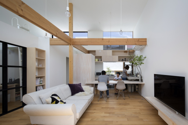 Dengan interior ruang keluarga dan dapur yang menyatu.