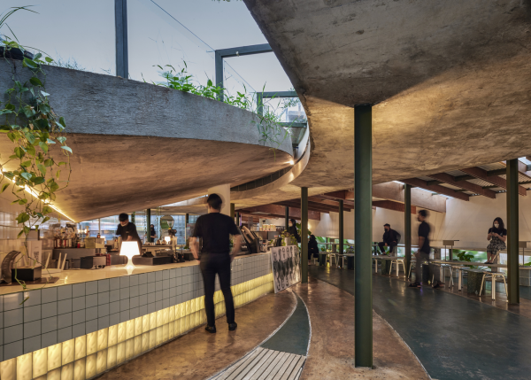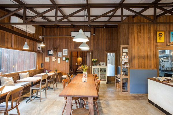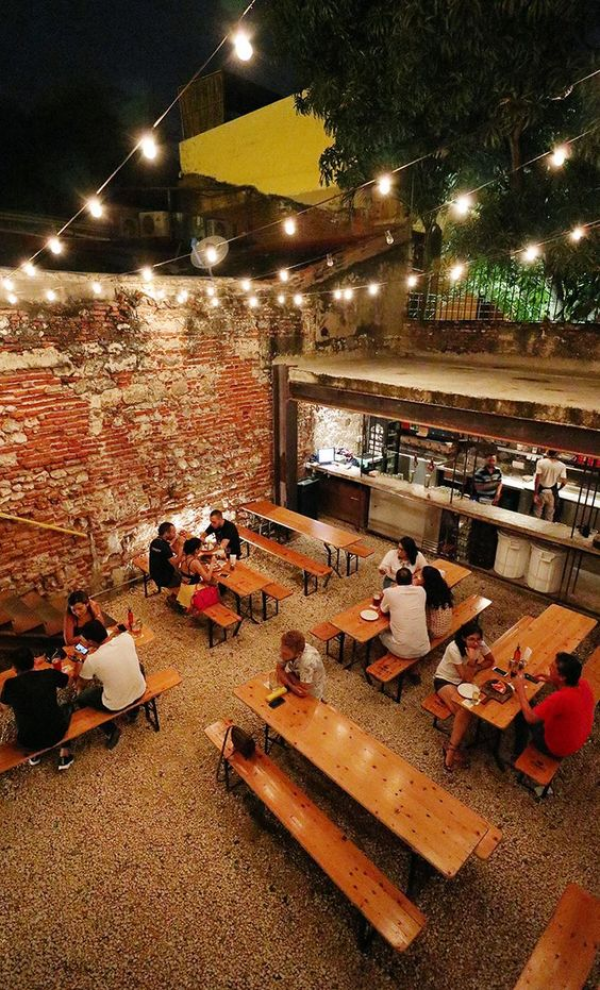 Cafe outdoor dengan dinding bata eksposnya.
