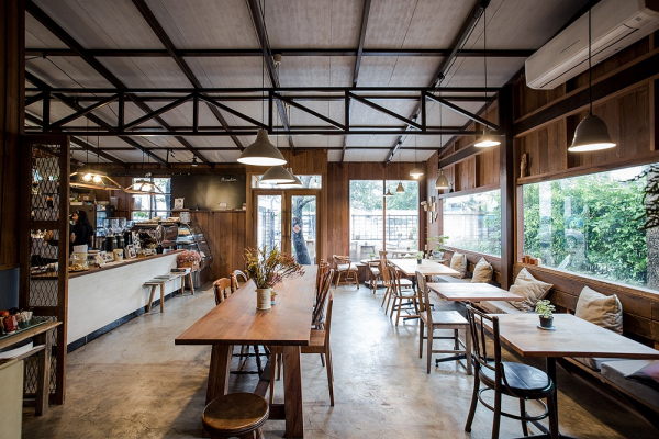 Kayu akan semakin meningkatkan kualitas suasana outdoor cafe Anda. Anda bisa menggunakan potongan-potongan kayu untuk mendekorasi bagian dinding atau untuk membuat tempat duduk di luar ruangan.