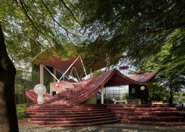 Dengan bentuk bangunannya yang unik.