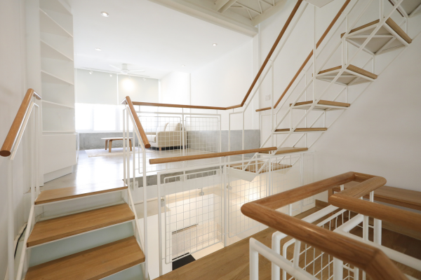 Ruang tamu dengan tangga sekaligus untuk prosotan anak.
