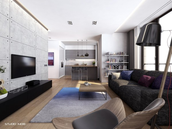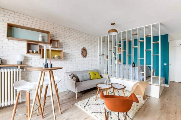 Interior apartemen minimalis dengan kombinasi warna yang menarik.