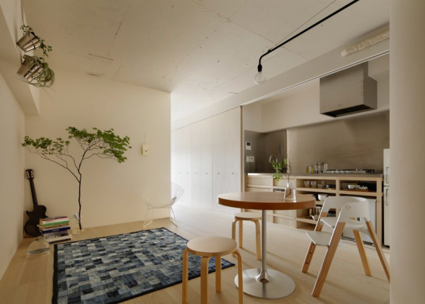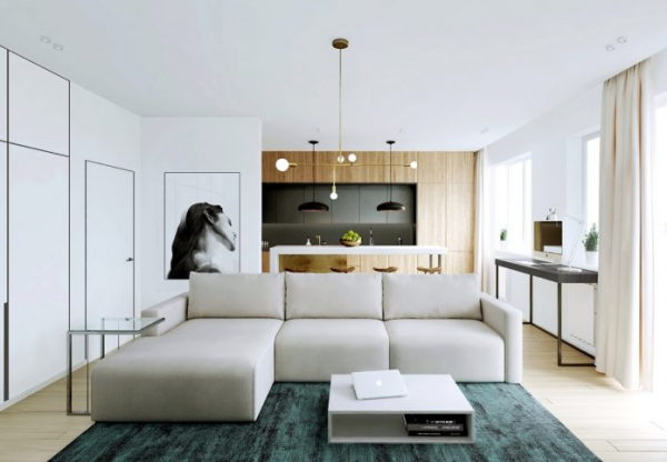 Interior apartemen minimalis dengan warna netralnya yang menarik.
