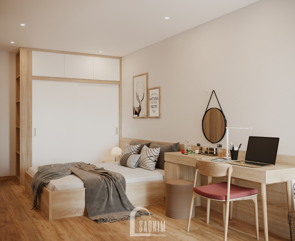 Interior kamar apartemen minimalis dengan meja kerjanya yang cantik.