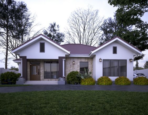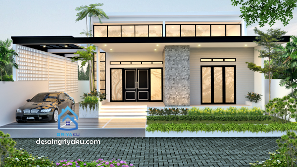 Desain rumah atap datar yang dipadukan dengan batu alam yang cantik.