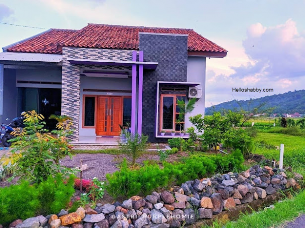 Fasad rumah yang asri dengan sentuhan batu alam pada dinding nya.