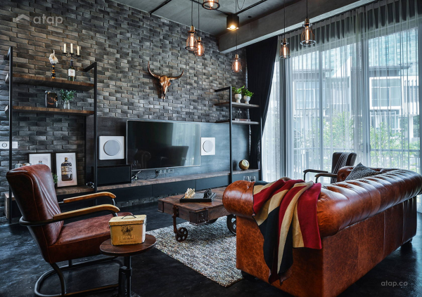 Kombinasi interior ruang tamu gaya industrial dan rustic yang menarik.