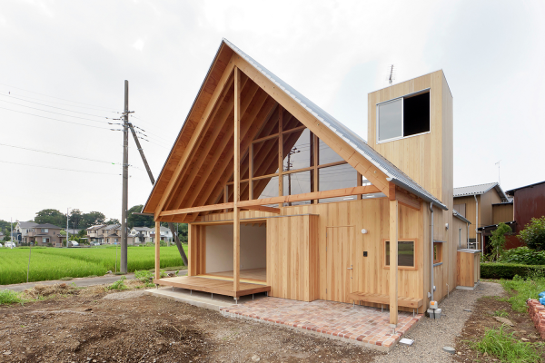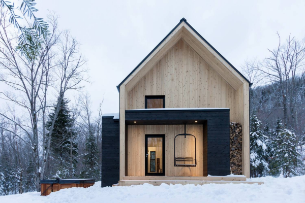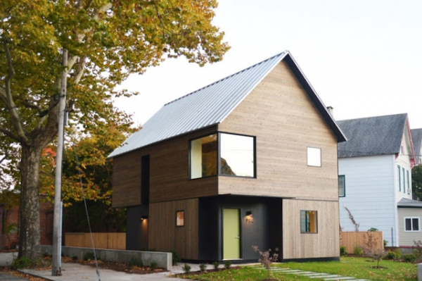 Rumah atap gable dengan dinding kayunya yang cantik.