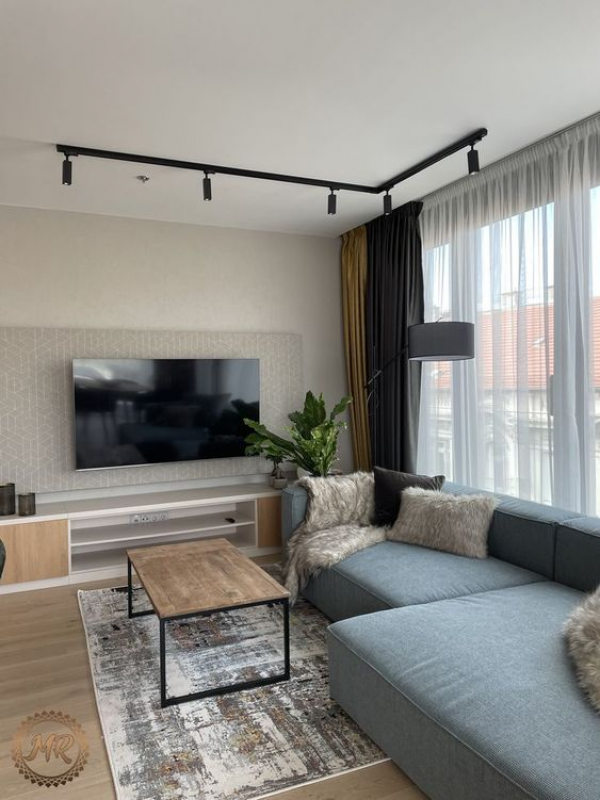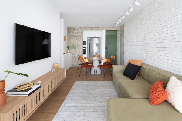 Ruang tamu minimalis elegan yang menyatu dengan dapur.