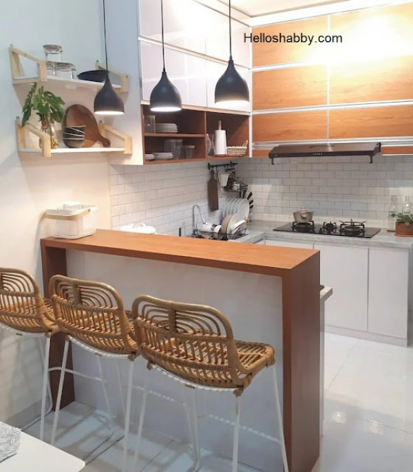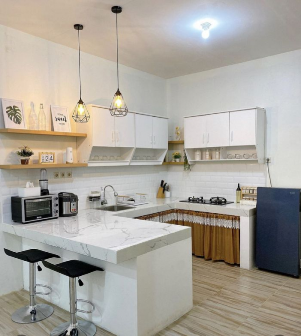 Dapur letter U dengan lampu hias gantungnya yang cantik.