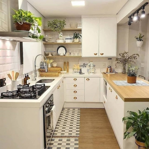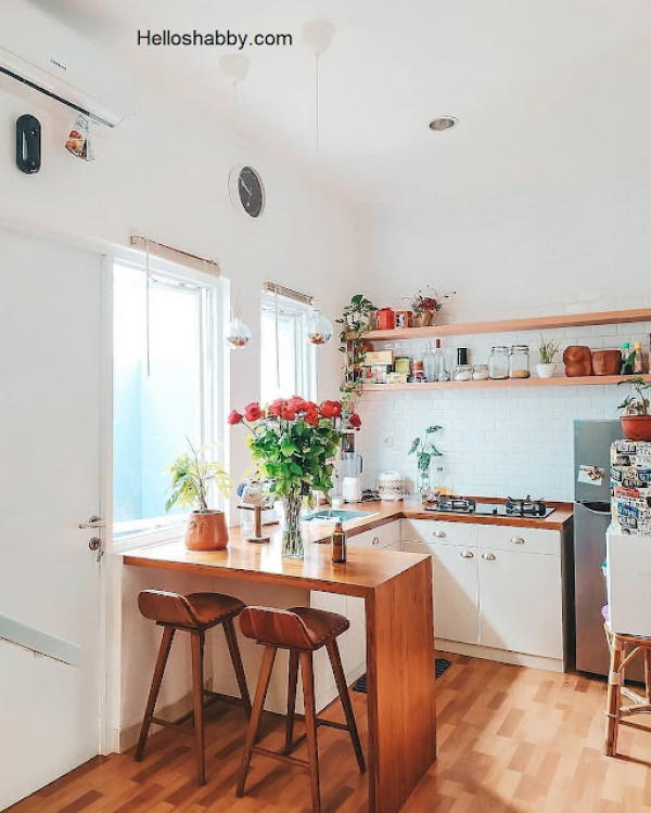 Dapur letter U dengan lantai aksen kayu yang cantik ya moms.