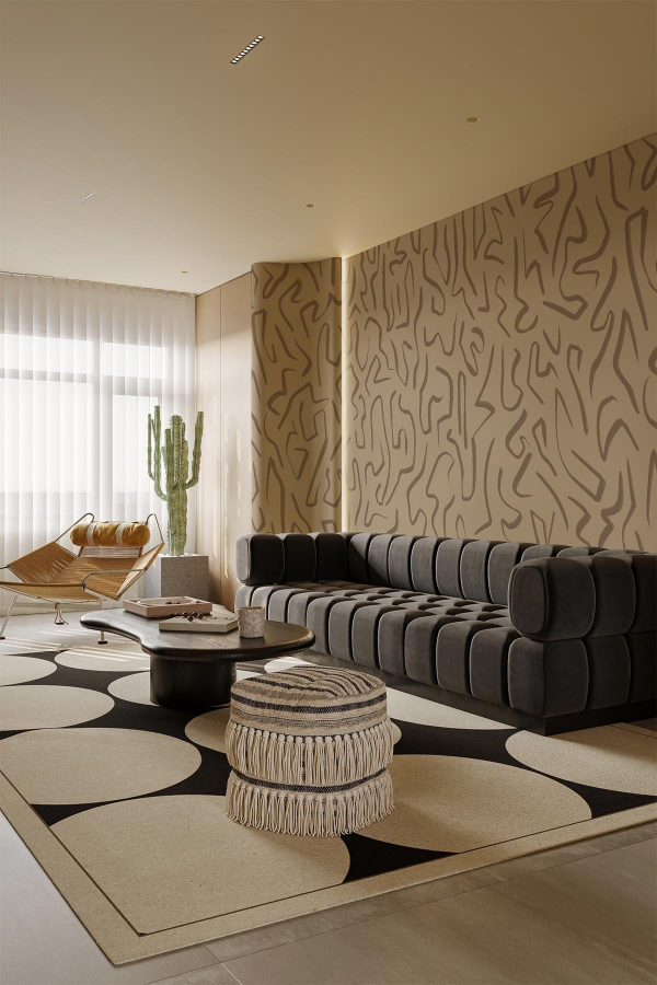 Interior ruang tamu abstrak yang hangat dengan wallpaper yang menarik.
