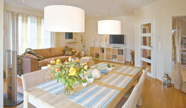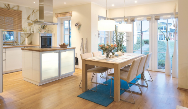 Dapur cantik dan meja makan yang menyatu dengan ruang keluarga.