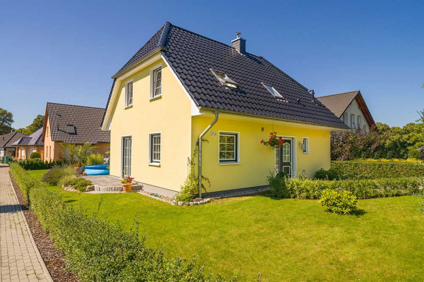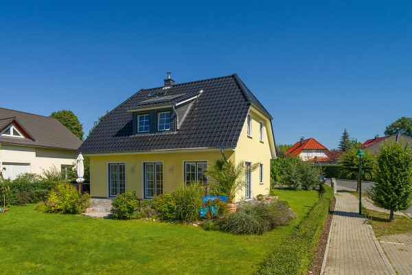 Rumah atap jerkinhead dengan warna kuning yang cantik.