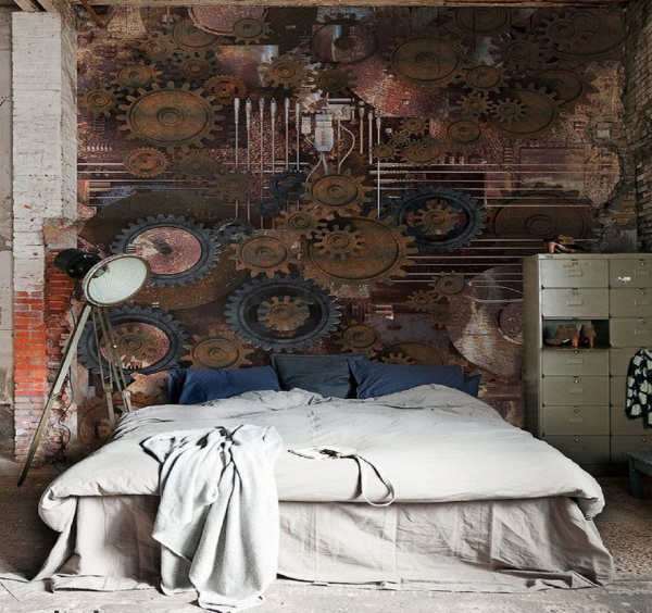 Kamar gaya steampunk dengan wallpaper yang keren.