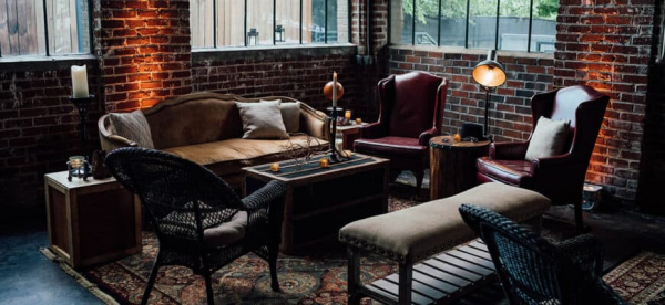 Interior ruang tamu gaya steampunk dengan dinding bata ekspos nya.