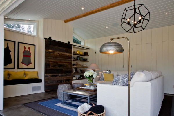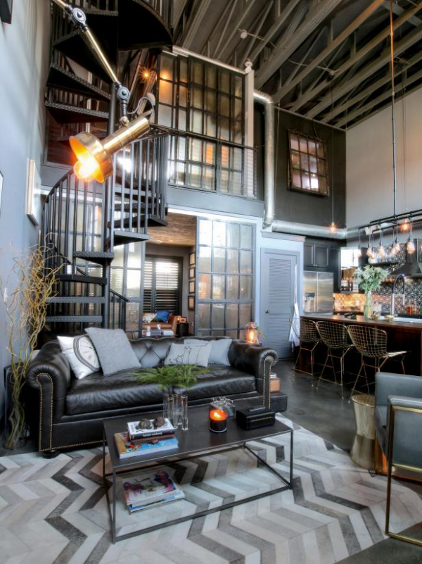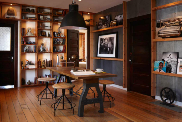 Interior ruang tamu gaya steampunk dengan rak besi dan lampu nya yang unik.