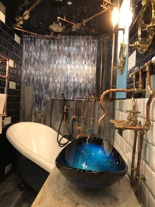 Desain kamar mandi gaya steampunk yang menarik bukan guys.