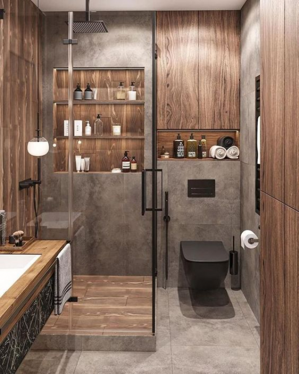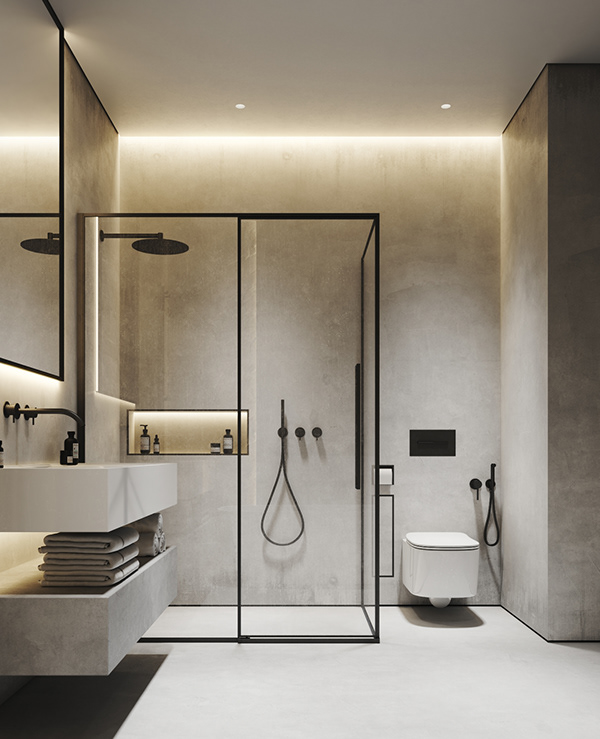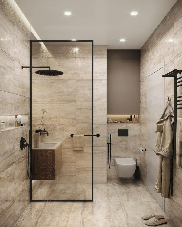 Gunakan aksesoris seperti rack atau gantungan untuk memberikan nilai tambah pada gaya minimalisme modern dalam mendesain kamar mandi minimalisme modern dengan rapi dalam waktu singkat.