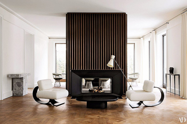 Interior postmodern style dengan dinding kayu nya yang cantik.