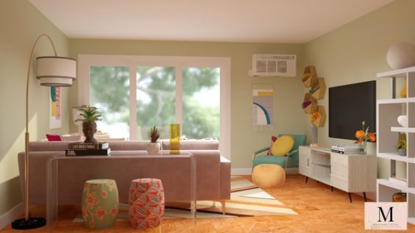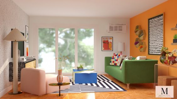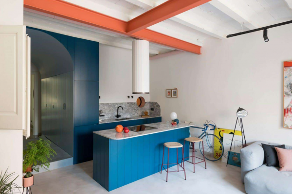 Interior postmodern dengan kombinasi warna yang cerah dan kalem.