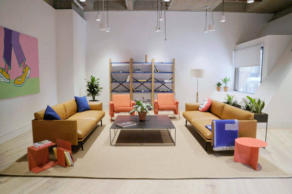 Interior ruang tamu post modern style dengan furniture nya yang warna-warni.