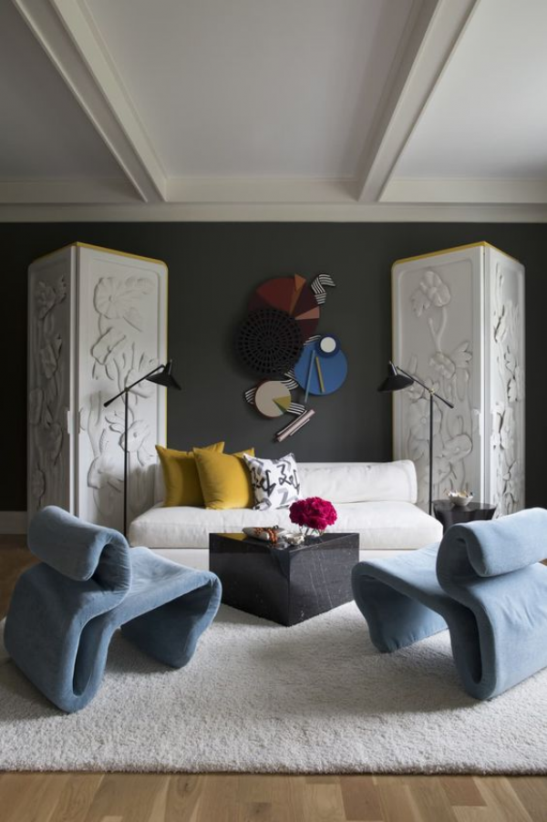 Ruang tamu gaya postmodern dengan kombinasi warna yang cantik.