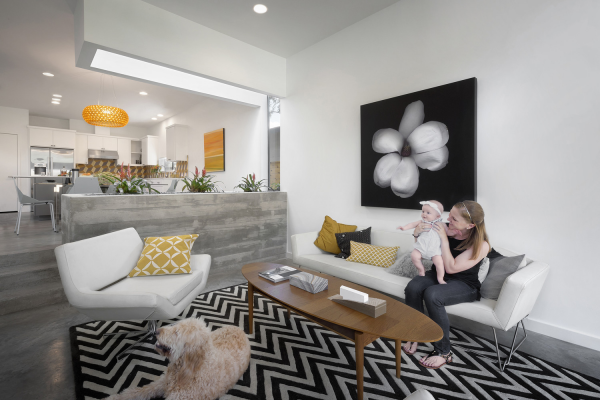 Ruang keluarga dengan partisi tembok semen eksposnya yang menarik.