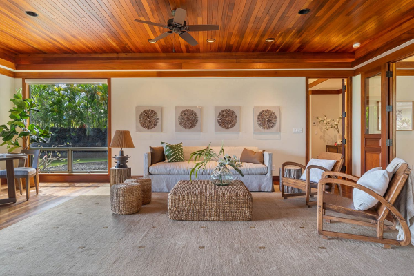 Suka dengan ruang tamu dengan plaaon kayunya yang cantik.