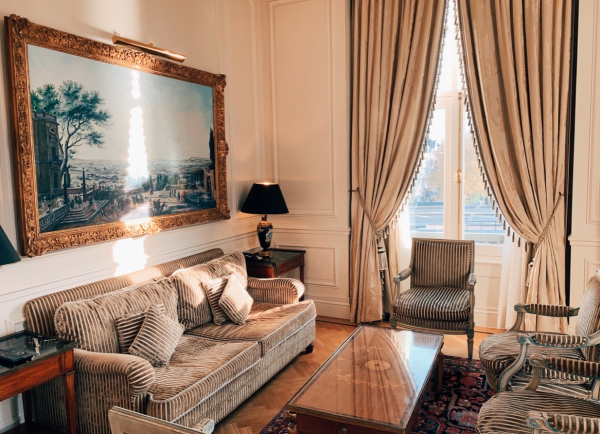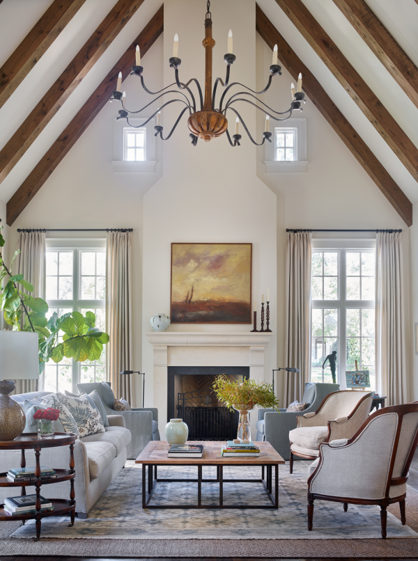 Interior rumah gaya Eropa dengan plafon yang tinggi.
