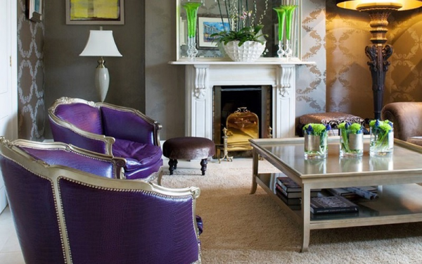 Interior ruang tamu rumah gaya Eropa dengan lampu hiasnya.