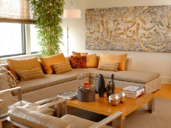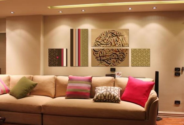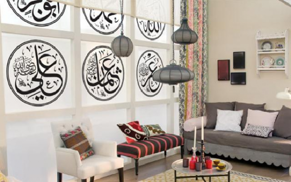 Interior ruang tamu Islami dengan kaligrafi yang sederhana.