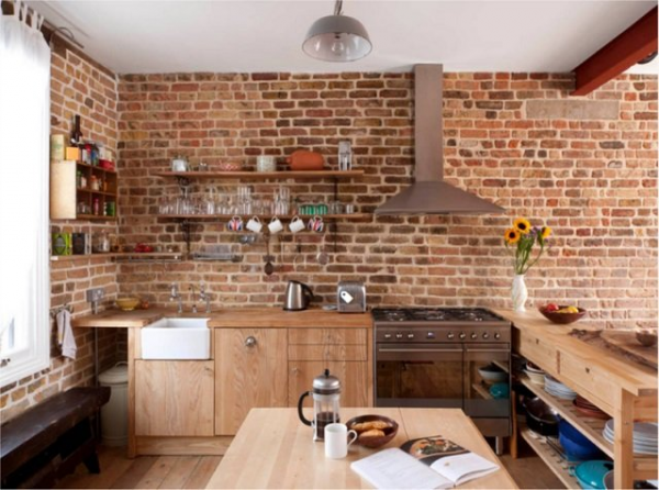 Dapur tema industrial dengan batu bata dan semen eksposnya.