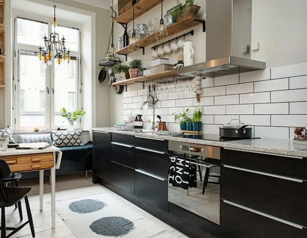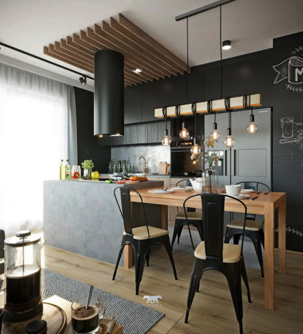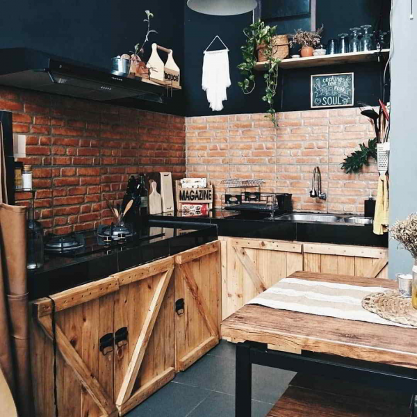 Dapur indutrial minimalis dengan kombinasi kayu, batu bata ekspos dan dominasi warna hitam yang cakep ya bun.