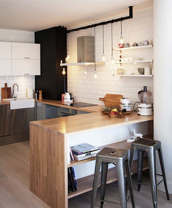 - Lampu gantung dan lampu meja yang terbuat dari metal dan kaca memberikan tampilan yang serasi dengan desain dapur rumah industrial. Anda dapat memilih lampu dengan penampilan yang unik untuk memberikan kesan yang lebih dramatis.