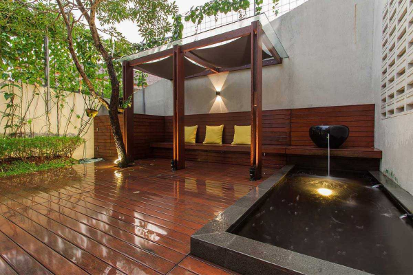 Teras belakang rumah dengan kolam mungil yang cantik.