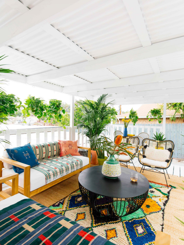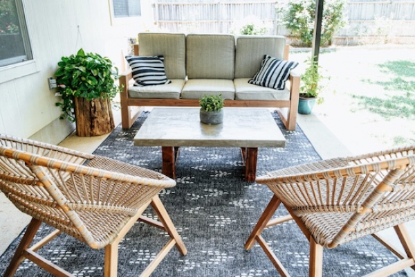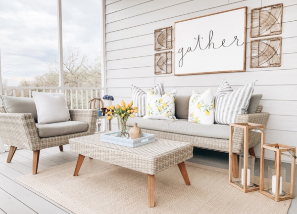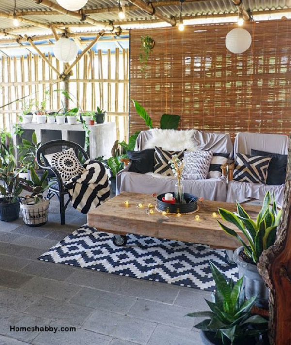 Teras jadi ruang tamu dengan sofa anyaman yang cantik.