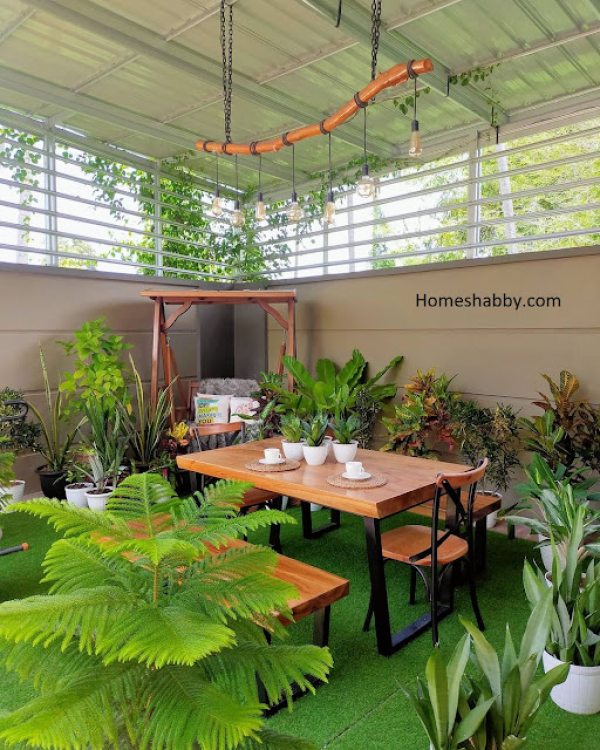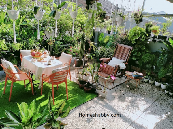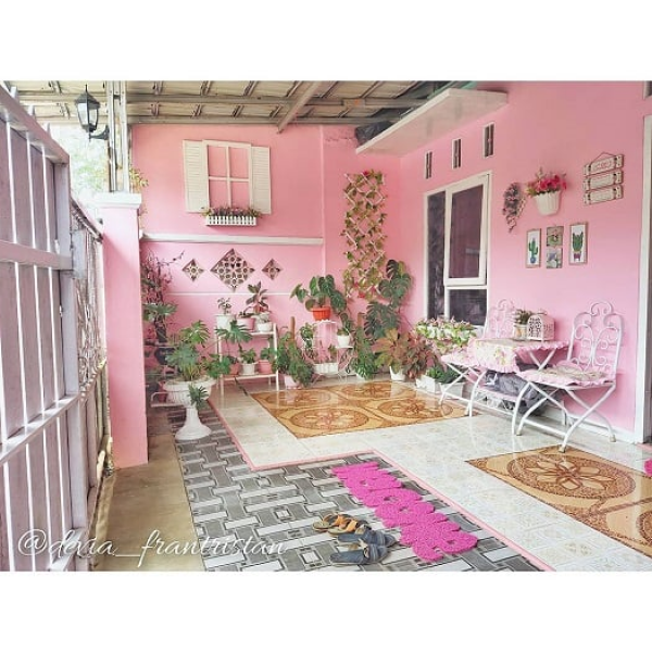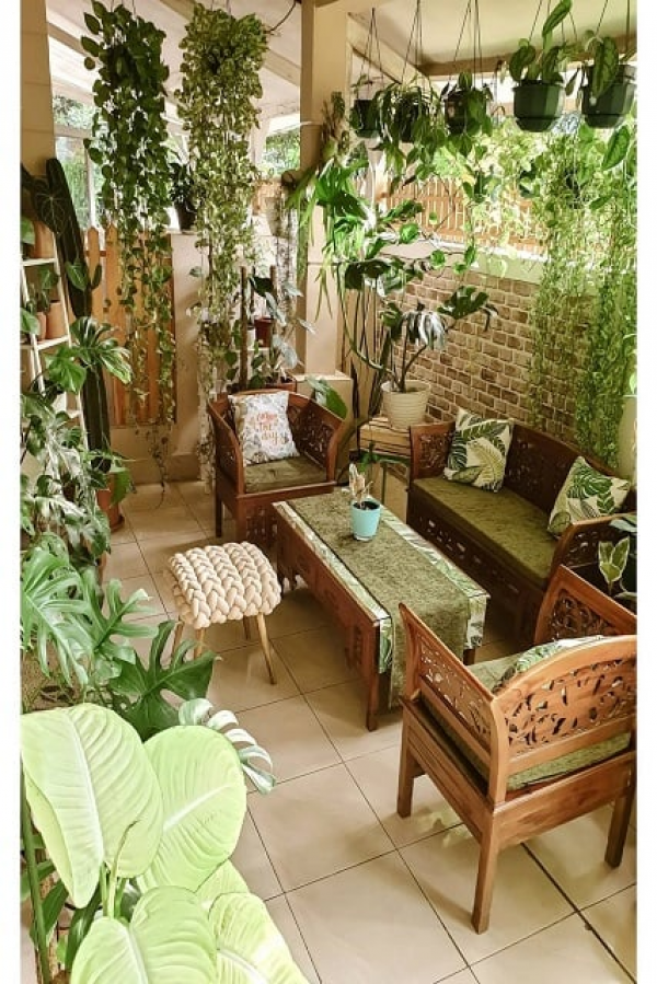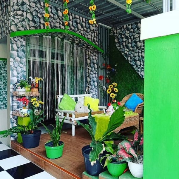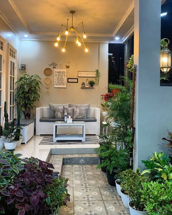 Teras jadi ruang tamu dengan taman mungil yang cantik.