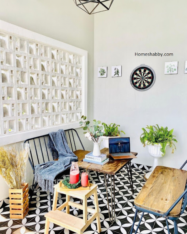Teras jadi ruang tamu dengan dinding roster dan meja kursi yang minimalis.