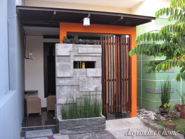 Teras jadi ruang tamu dengan sekat penghubung batu alam dari kayu.