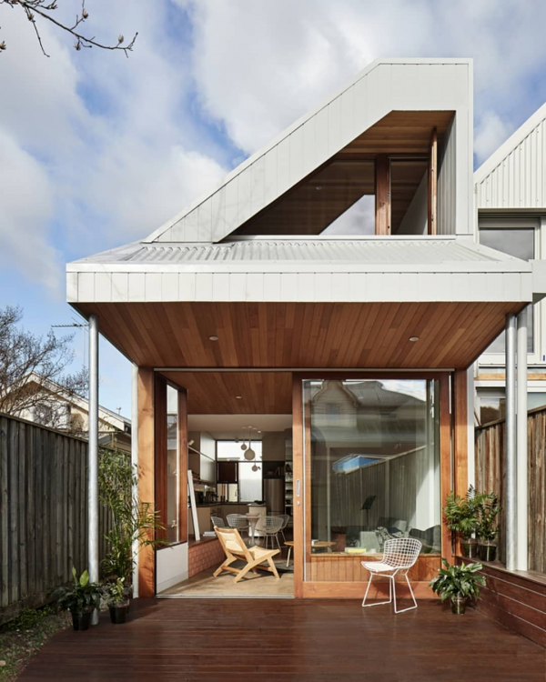 Teras jadi ruang tamu dengan material kayu yang menarik.