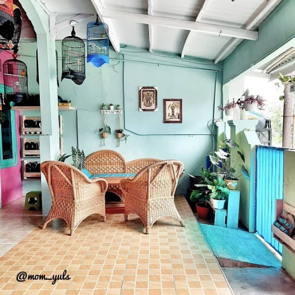 Teras jadi ruang tamu dengan wallpaper yang menarik.