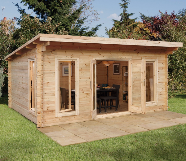 Rumah kayu yang cantik dengan atap miring satu sisi.