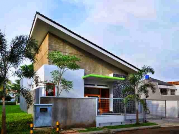 Rumah dengan atap miring satu sisi dengan kombinasi dak cor yang cantik bukan.