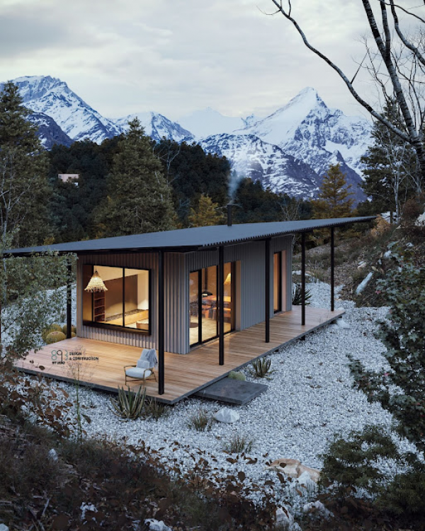 Rumah kontainer dengan atap miring satu sisi yang sederhana.